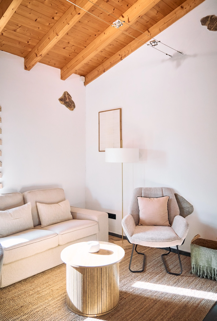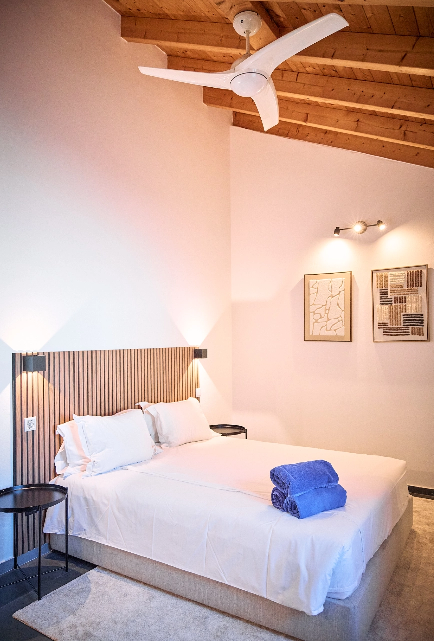 Cada suite dispõe de um quarto, uma ampla área de estar em plano aberto com um confortável sofá-cama – proporcionando flexibilidade adicional para famílias -, uma cozinha totalmente equipada e generosas portas de vidro que inundam o interior de luz natural e se abrem para um terraço privado, perfeito para refeições ao ar livre ou para apreciar a tranquilidade das vinhas.