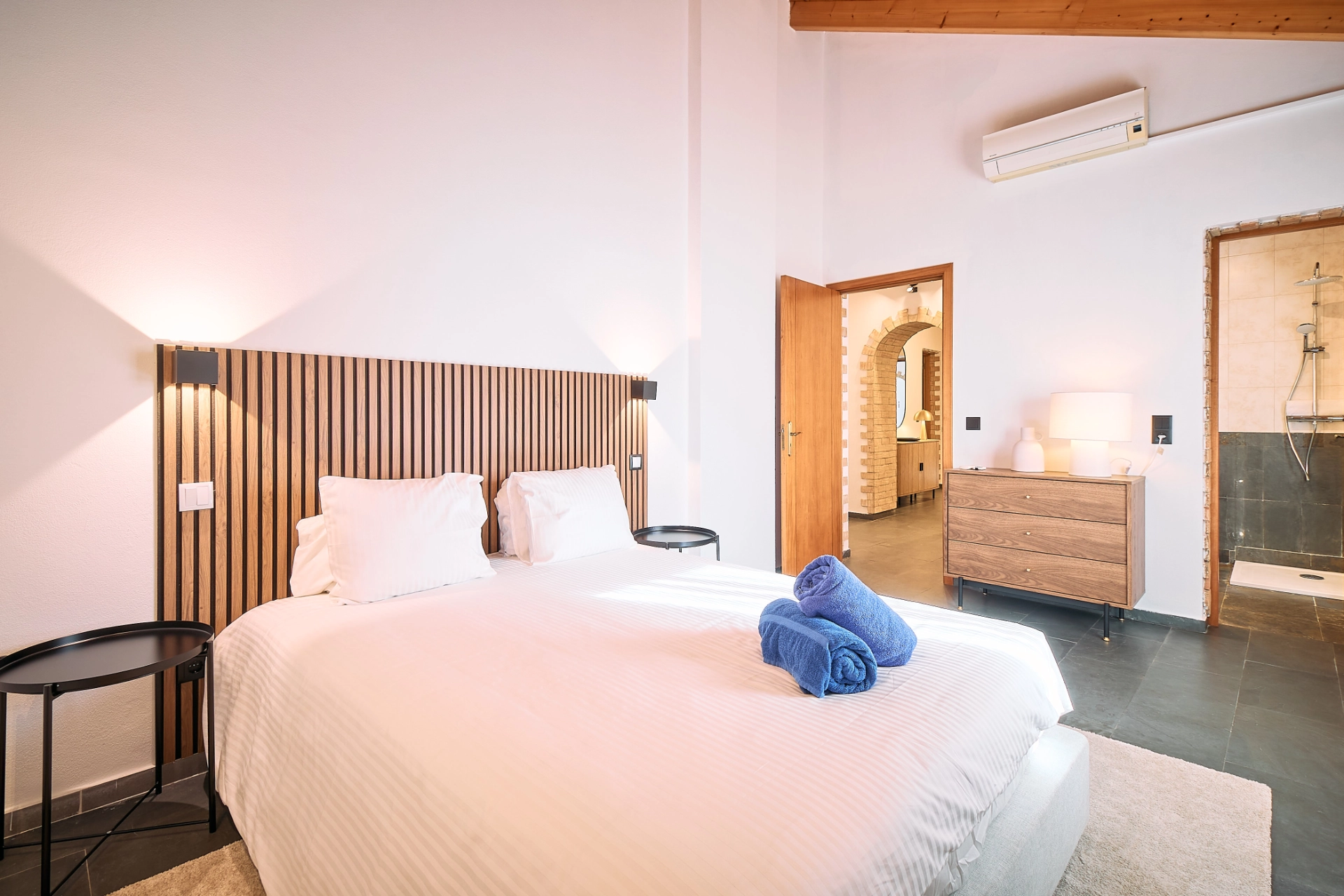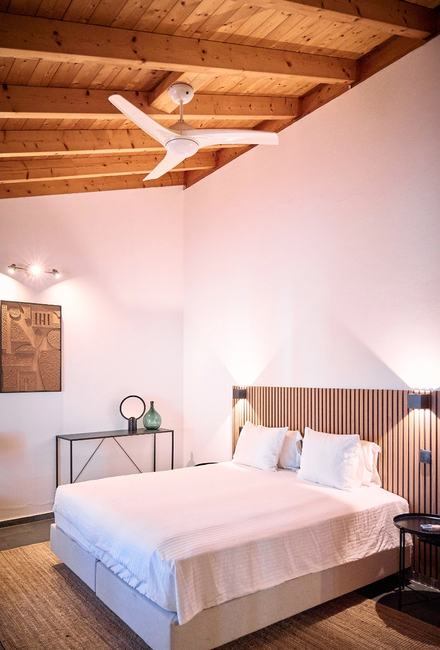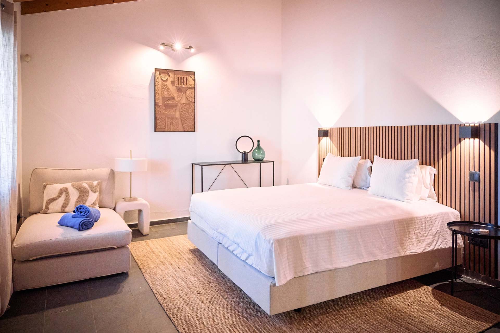 Com uma decoração elegante, as suites combinam linhas simples, texturas naturais e uma paleta de cores suaves inspiradas na natureza. Cada espaço reflete um aspeto único da paisagem envolvente — com tons de verde que ecoam as vinhas e o campo, e azuis que evocam o céu aberto e a costa algarvia.